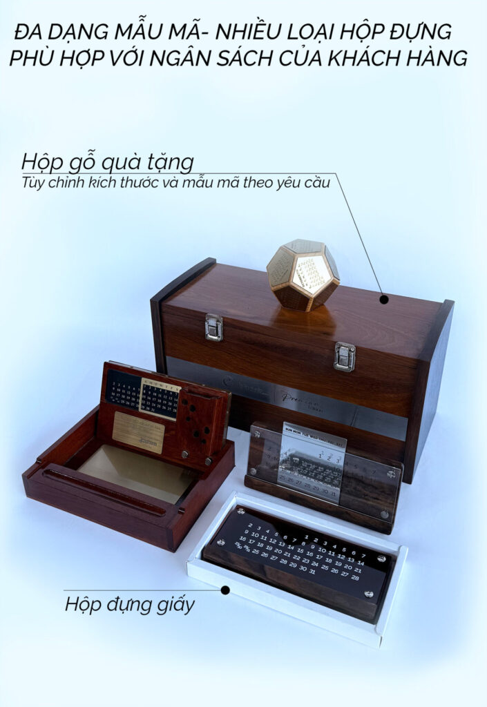 Bên cạnh đó, lịch đi kèm nhiều loại hộp đựng như hộp giấy cao cấp, hộp gỗ, hộp bọc da hoặc hộp thiết kế riêng theo yêu cầu, giúp nâng tầm giá trị quà tặng.
