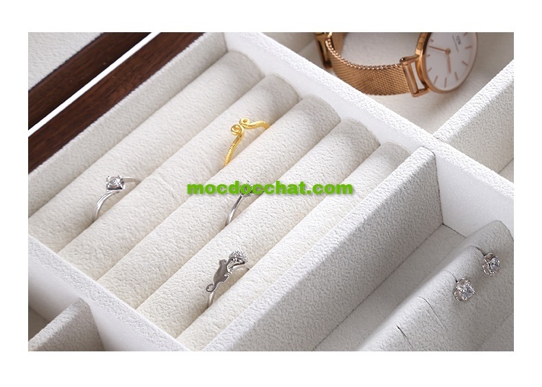 Ngăn đựng bên trên như những mẫu trang sức cùng dòng. Không gian được chia làm nhiều ô đựng nhỏ được phân tách rõ ràng. mỗi ô đựng mang theo kích thước khác nhau. Nhờ đó, đa dạng các mẫu trang sức sẽ có vị trí riêng. Nhẫn, hoa tai, phụ kiện, đồng hồ, cài áo,… đều có cho mình một vị trí riêng. An toàn ngăn nắp và hạn chế được va chạm gây trầy xước.
